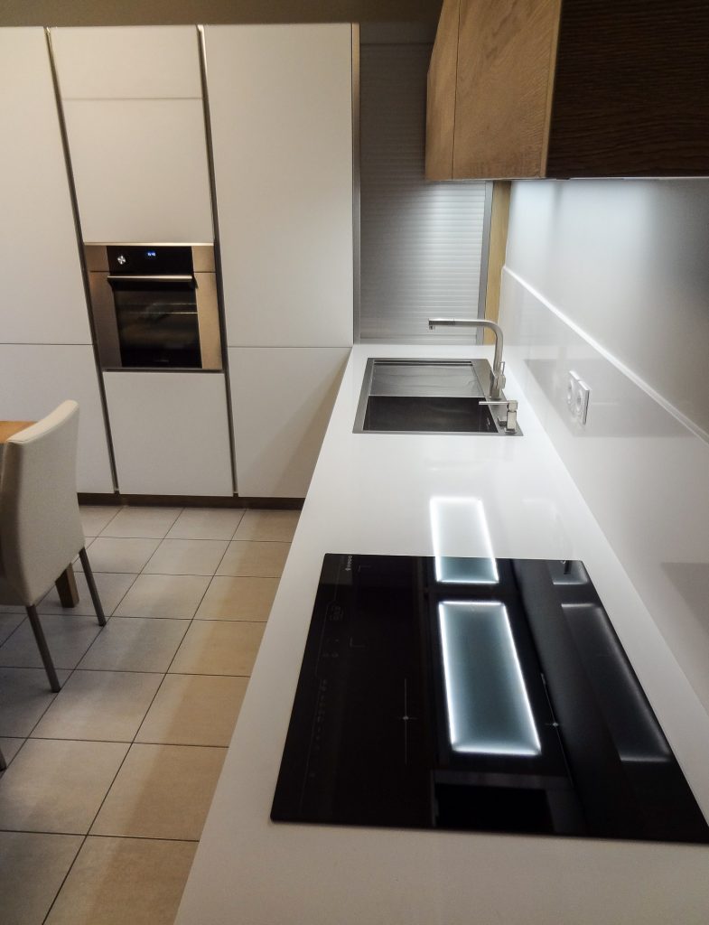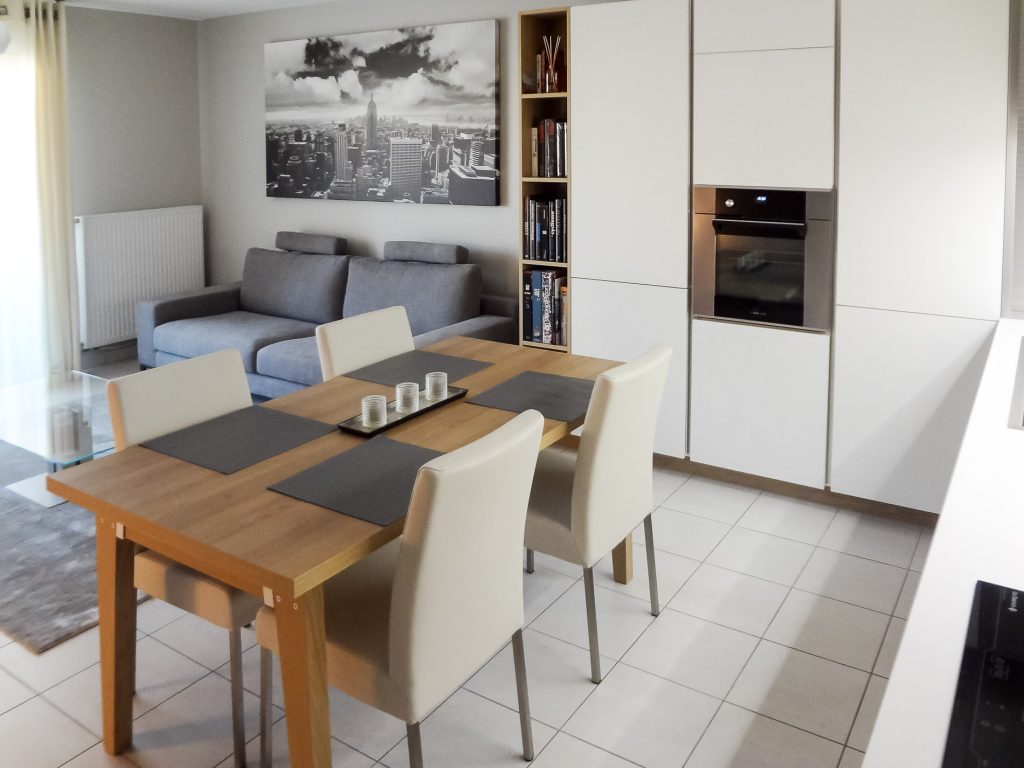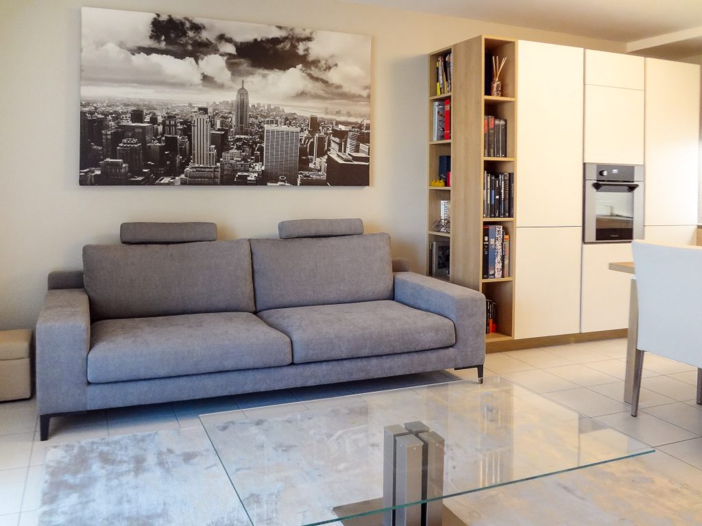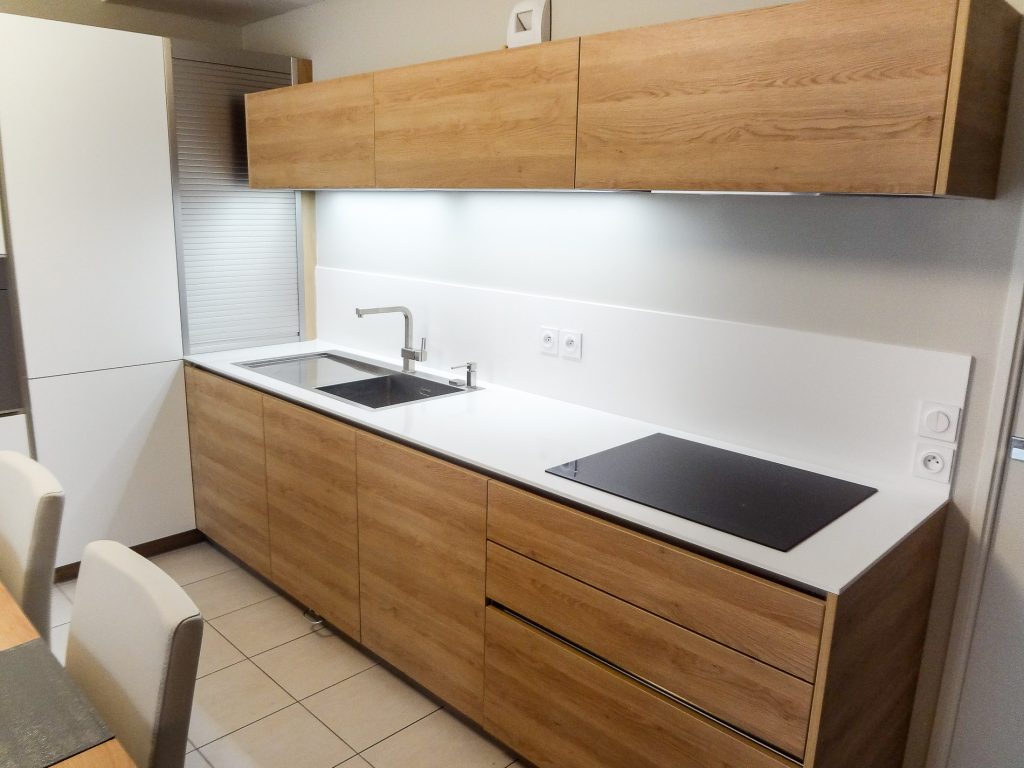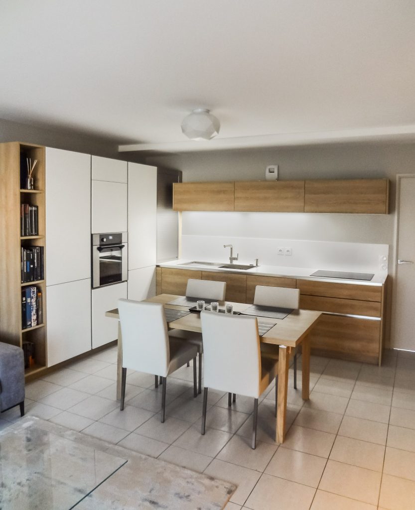 Pour cette cuisine américaine, j’ai choisi du blanc laqué, du chêne blond, du grège et du gris. Pour la jonction avec le salon, j’ai dû créer une partie bibliothèque, rattachée à trois colonnes techniques recevant le four, le réfrigérateur-congélateur, du rangement et enfin un meuble rideau astucieux qui cache le petit électroménager. Perpendiculairement se trouvent les zones évier avec cuve inox et zone cuisson avec hotte intégrée dans l’élément haut dont les étagères en verre sont rétro-éclairées. Le plan de travail est en pierre de synthèse comme la crédence pensée en faible hauteur. L’ouverture des rangements se fait par gorges inox intégrées. J’ai opté pour cette table de salle à manger en chêne blond et ces quatre chaises intemporelles, ce canapé contemporain, cette table basse en verre réchauffée par un grand tapis poils longs gris perle, ce tableau-photo noir et blanc pour donner de la profondeur. J’ai fait le choix d’un plafonnier et d’une suspension en verre soufflé blanc, de la même collection.
