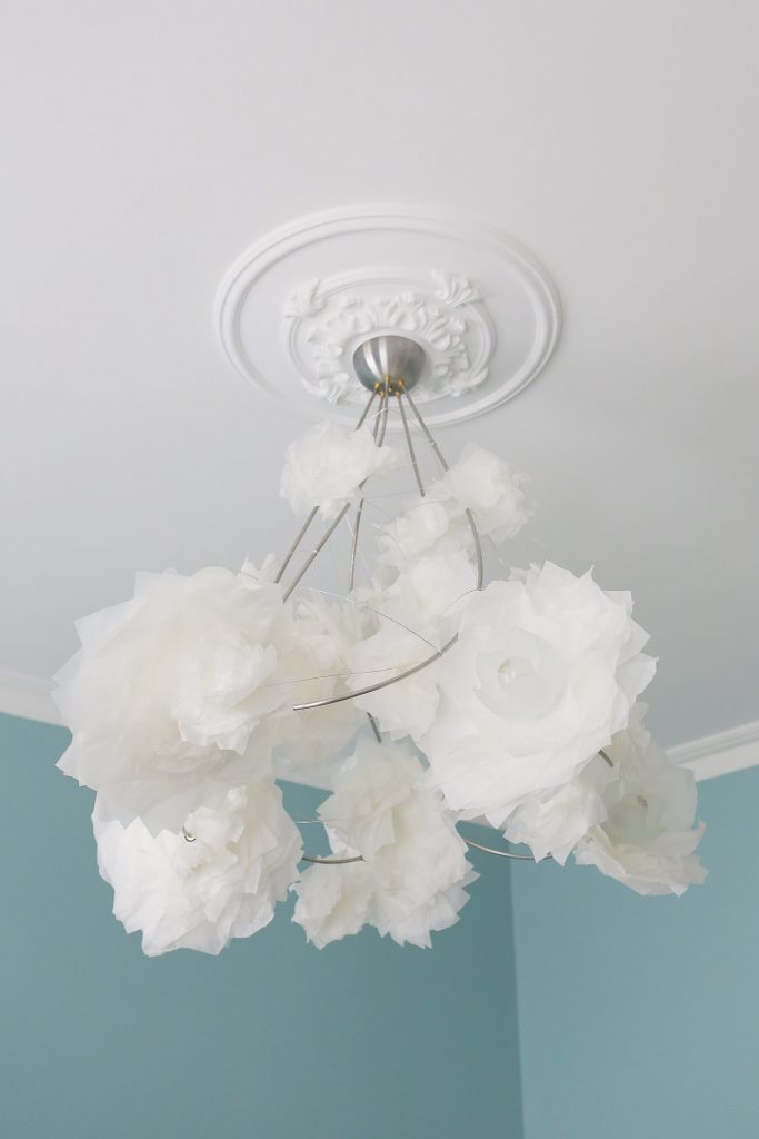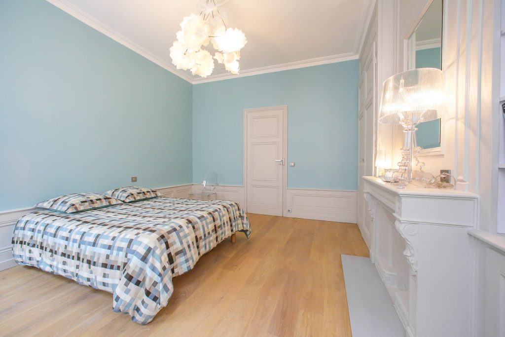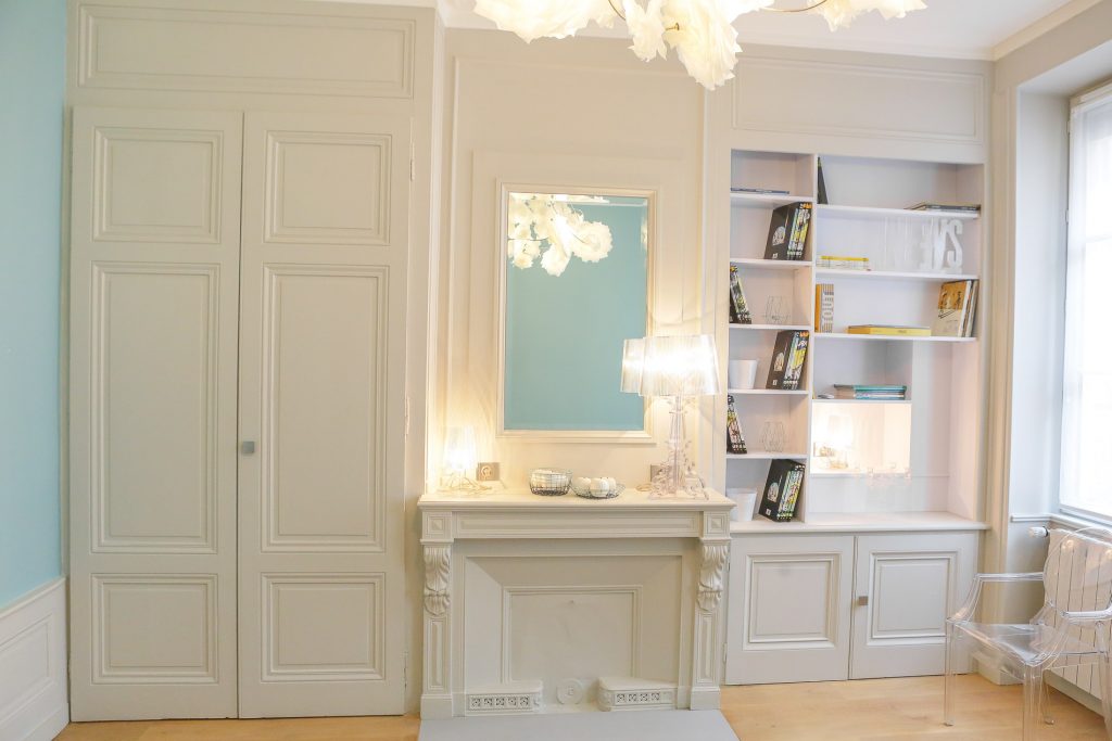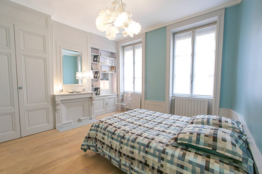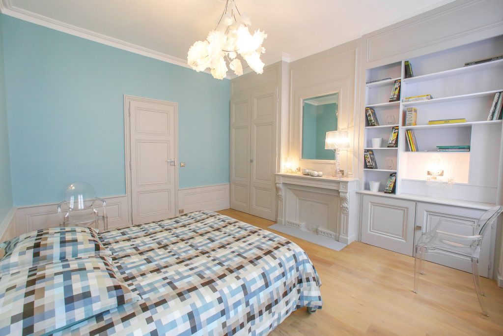 Dans cette chambre d’amis aux proportions confortables et au cachet indéniable de par les stylobates, les moulures, la cheminée et la belle hauteur sous plafond, j’ai opté pour un parquet chêne lame large d’aspect mat pour le côté contemporain et chaud, des peintures en finition mate de couleur taupe clair et vert d’eau très tendance, coloris que j’ai transposé pour le choix du linge de lit qui apporte un côté très graphique avec son motif. J’ai aménagé le placard en dressing modulable et la partie de droite en espace rangement et bibliothèque. J’ai choisi un nouveau seuil de cheminée en pierre et une nouvelle rosace pour s’adapter aux proportions généreuses de cette suspension très poétique faite en papier. J’ai rajouté trois lampes à poser en polycarbonate sur la cheminée et dans la bibliothèque ainsi que deux fauteuils dans le même matériau. Quelques objets décoratifs complètent cet ensemble. Les stores sont réalisés sur-mesure et laissent passer la lumière tout en préservant l’intimité.