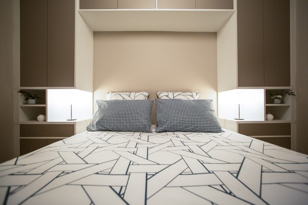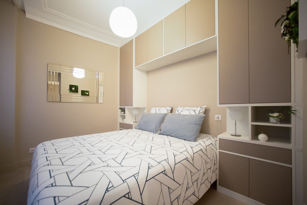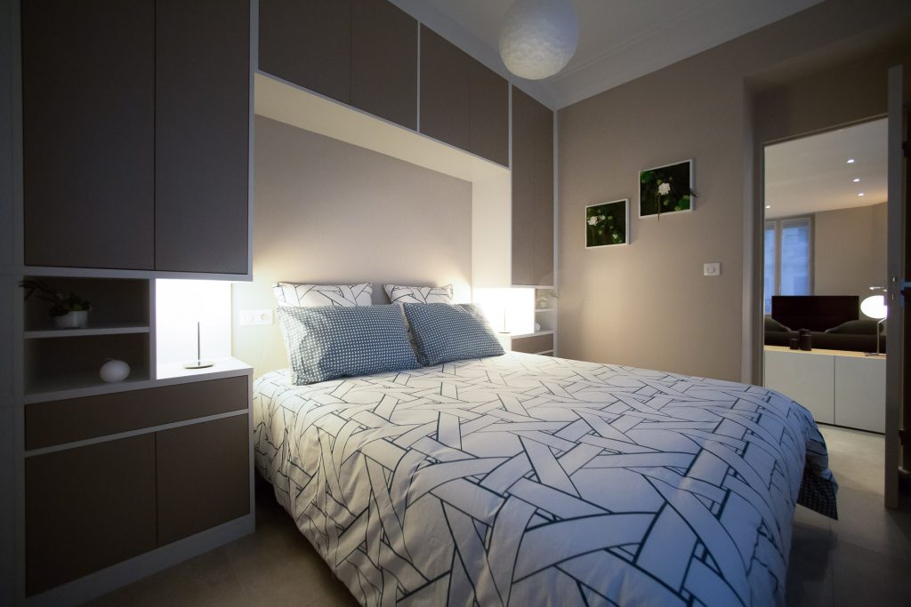 Cette chambre était au préalable une salle d’attente de cabinet médical, elle est donc de petite taille et il fallait intégrer un lit en 160cm avec le plus de rangements possible et ne surtout pas se sentir dans un espace confiné. J’ai donc pensé la conception d’une composition sur-mesure avec chevets intégrés en faible profondeur mais en grande hauteur et ce, sans poignées pour alléger visuellement la structure. J’ai opté pour un combo de couleur taupe et blanc en finition mat, avec un rappel de peinture taupe mat sur les murs et un carrelage grand format associé. La suspension et les lampes de chevet en verre soufflé apportent clarté et douceur dans cette pièce. J’ai choisis du linge de lit blanc et bleu canard très contemporain avec un motif de cannage stylisé, de petits éléments de décoration dans les niches. Pour l’habillage des murs, un grand miroir qui apporte de la profondeur et deux tableaux végétaux pour apporter un côté bucolique à cette pièce de nuit.