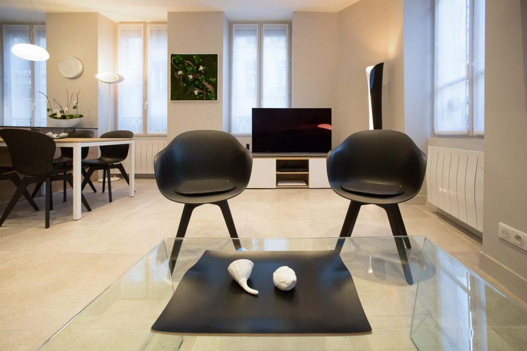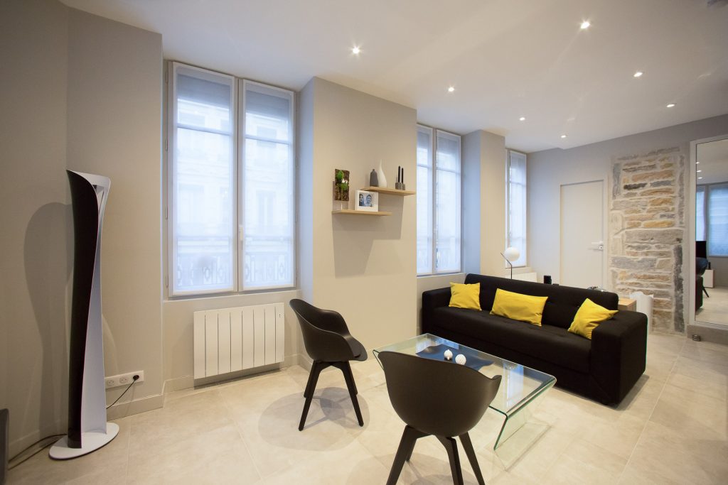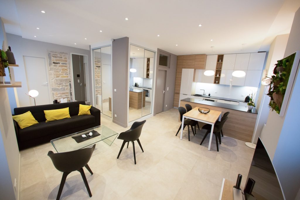 A l’origine, il y avait plusieurs cloisons que j’ai fait abattre pour retrouver un grand volume pour l’entrée et la pièce à vivre. J’ai pris le parti d’une décoration très contemporaine avec en code couleur du taupe, du noir, du blanc et du moutarde, teintes qui s’harmonisent très bien avec le mur en pierre qui était avant caché par une cloison. J’ai choisi un canapé convertible à la demande des clients de forme assez rectiligne et des coussins, une table basse en verre transparent pour libérer l’espace et des fauteuils pour la convivialité. J’ai fait réaliser sur-mesure un meuble TV avec les contraintes techniques de la hi-fi, des étagères et un meuble de rangement à l’entrée pour créer une séparation. Tout cet ensemble est dans le même matériau que la cuisine pour l’homogénéité. Côté déco, je me suis chargée de la sélection du tableau végétal, des objets décoratifs et du porte-parapluie. Lampadaires et lampe à poser illuminent l’espace et sont agrémentés de spots intégrés. Les stores blancs filtrent la lumière.