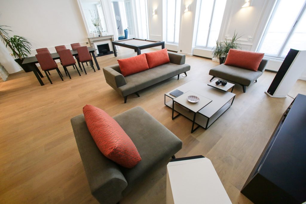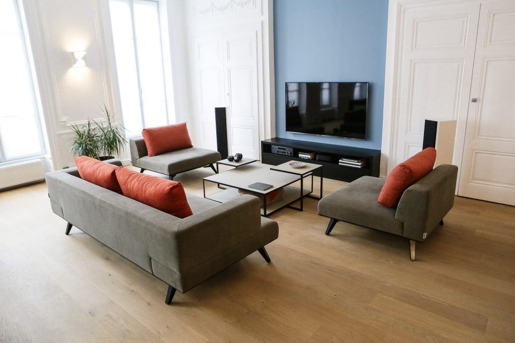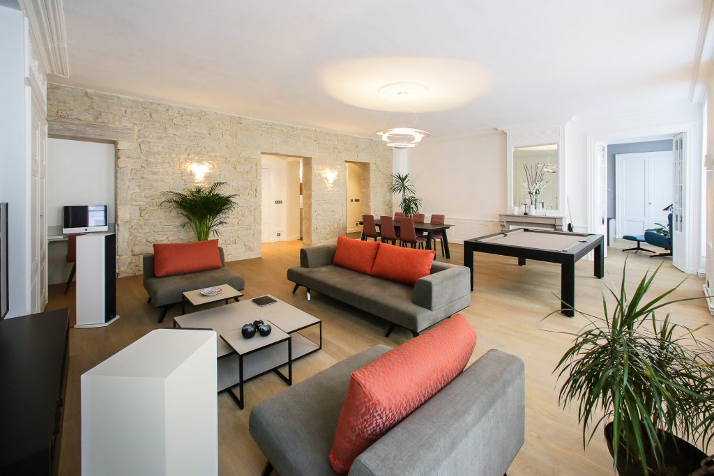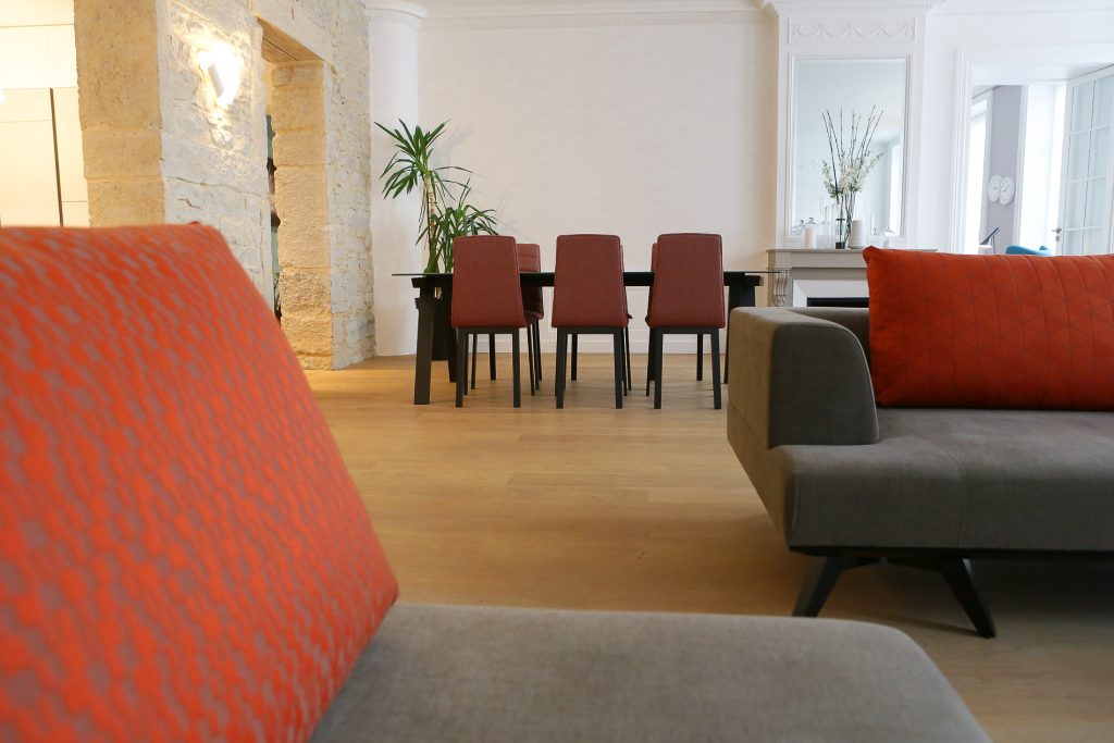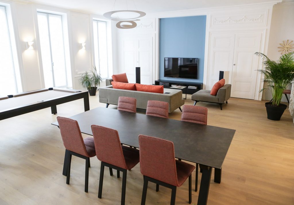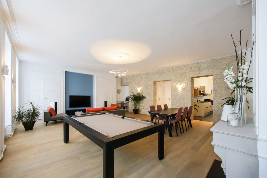 Pour cette belle pièce à vivre de 60m2, j’ai souhaité apporter un style contemporain au cachet existant. J’ai choisi cet ensemble canapé et fauteuils avec un tissu taupe et des coussins corail, cette table basse en verre couleur grège mat en trois parties, cette table de repas avec plateau en céramique habillée de chaises confortables et élégantes. J’ai dessiné le meuble TV, fait laquer les enceintes en blanc mat et la structure du billard en noir mat dont le tapis existant a été remplacé par un tissu taupe. J’ai fait changer le seuil de cheminée pour de l’ardoise. J’ai créé un espace bureau en angle avec rangements intégrés. Tous les placards ont été réaménagés. Les murs sont blancs pour contrebalancer avec le mobilier de couleur, avec une touche de bleu. J’ai fait réaliser des stores en voilage pour l’intimité. Côté luminaires, une grande suspension design avec une rosace adaptée, des appliques pour mettre en lumière le mur en pierre et le mur opposé. Pour la touche finale, des plantes et quelques objets décoratifs.