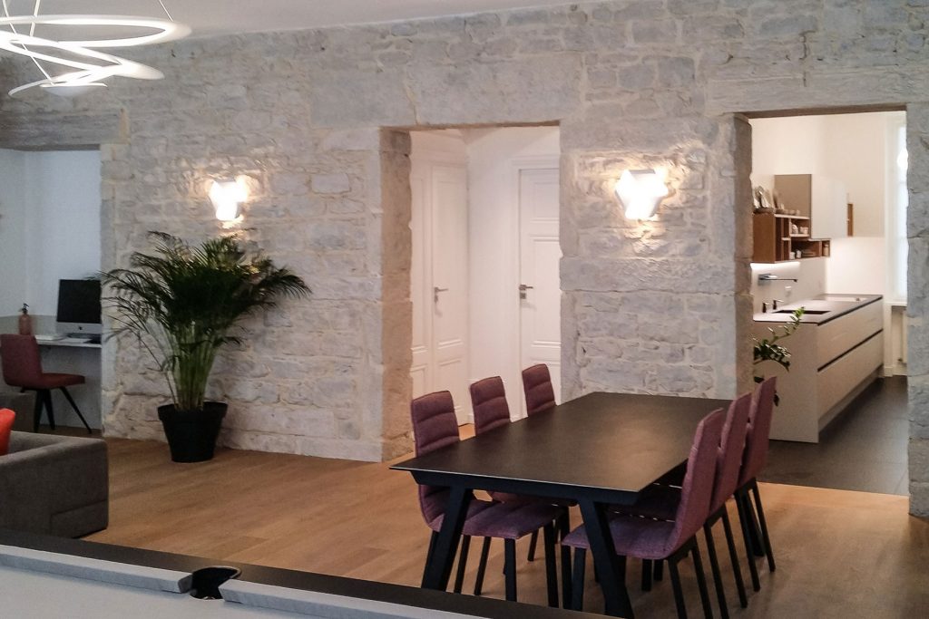 Pour cette belle pièce à vivre de 60m2, j’ai souhaité apporter un style contemporain au cachet existant. J’ai choisi cet ensemble canapé et fauteuils avec un tissu taupe et des coussins corail, cette table basse en verre couleur grège mat en trois parties, cette table de repas avec plateau en céramique habillée de chaises confortables et élégantes. J’ai dessiné le meuble TV, fait laquer les enceintes en blanc mat et la structure du billard en noir mat dont le tapis existant a été remplacé par un tissu taupe. J’ai fait changer le seuil de cheminée pour de l’ardoise. J’ai créé un espace bureau en angle avec rangements intégrés. Tous les placards ont été réaménagés. Les murs sont blancs pour contrebalancer avec le mobilier de couleur, avec une touche de bleu. J’ai fait réaliser des stores en voilage pour l’intimité. Côté luminaires, une grande suspension design avec une rosace adaptée, des appliques pour mettre en lumière le mur en pierre et le mur opposé. Pour la touche finale, des plantes et quelques objets décoratifs.