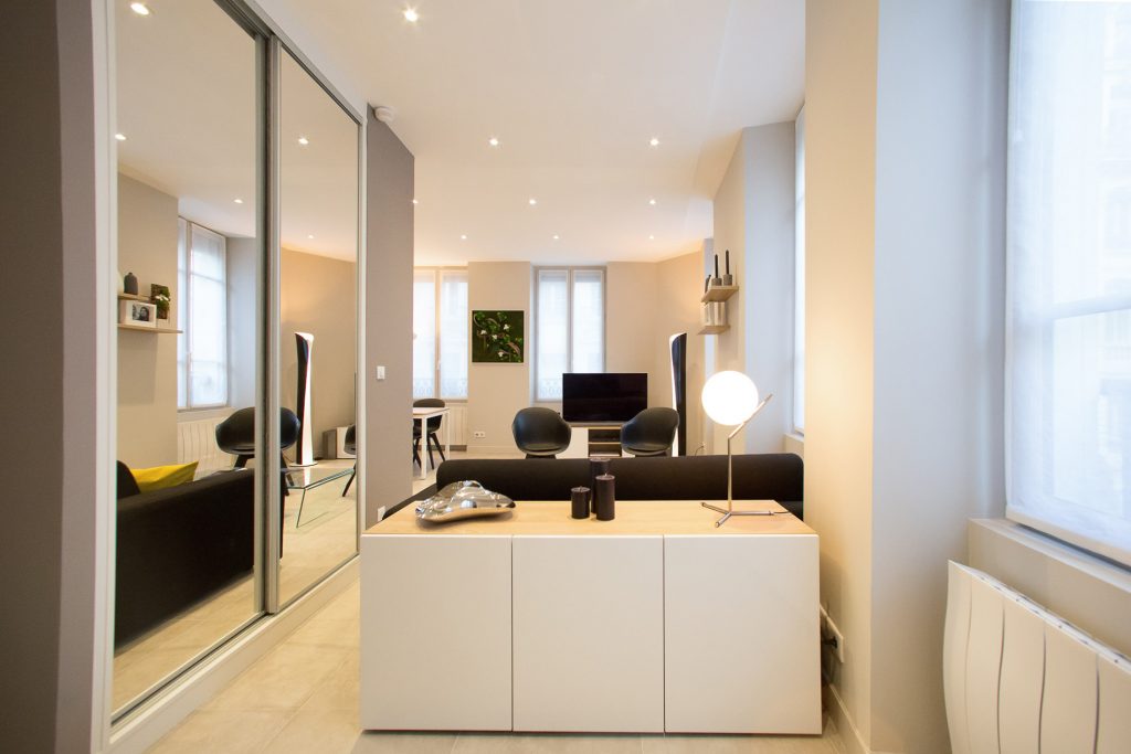 A l’origine, il y avait plusieurs cloisons que j’ai fait abattre pour retrouver un grand volume pour l’entrée et la pièce à vivre. J’ai pris le parti d’une décoration très contemporaine avec en code couleur du taupe, du noir, du blanc et du moutarde, teintes qui s’harmonisent très bien avec le mur en pierre qui était avant caché par une cloison. J’ai choisi un canapé convertible à la demande des clients de forme assez rectiligne et des coussins, une table basse en verre transparent pour libérer l’espace et des fauteuils pour la convivialité. J’ai fait réaliser sur-mesure un meuble TV avec les contraintes techniques de la hi-fi, des étagères et un meuble de rangement à l’entrée pour créer une séparation. Tout cet ensemble est dans le même matériau que la cuisine pour l’homogénéité. Côté déco, je me suis chargée de la sélection du tableau végétal, des objets décoratifs et du porte-parapluie. Lampadaires et lampe à poser illuminent l’espace et sont agrémentés de spots intégrés. Les stores blancs filtrent la lumière.