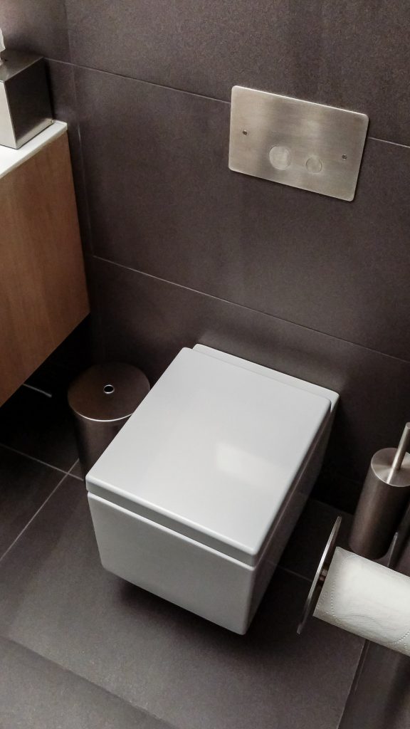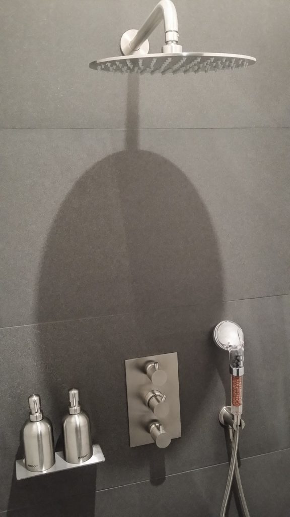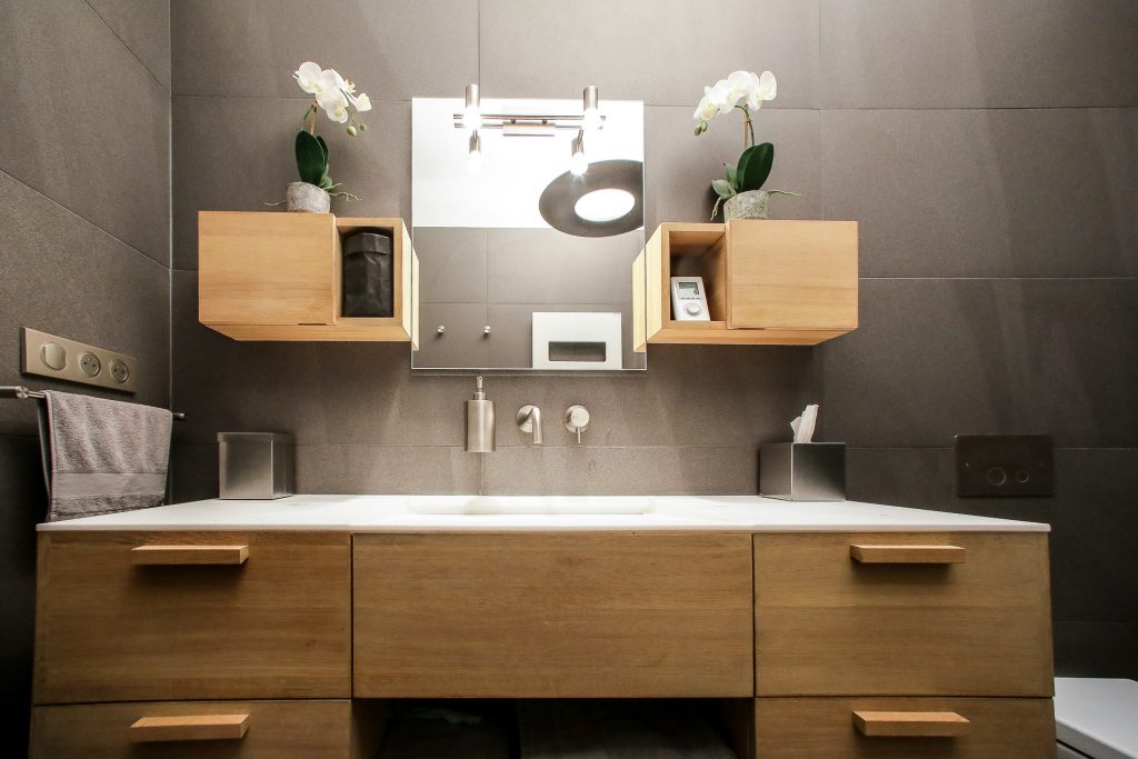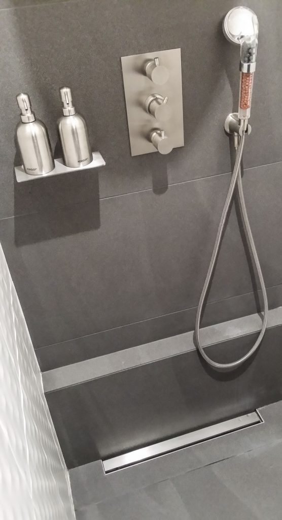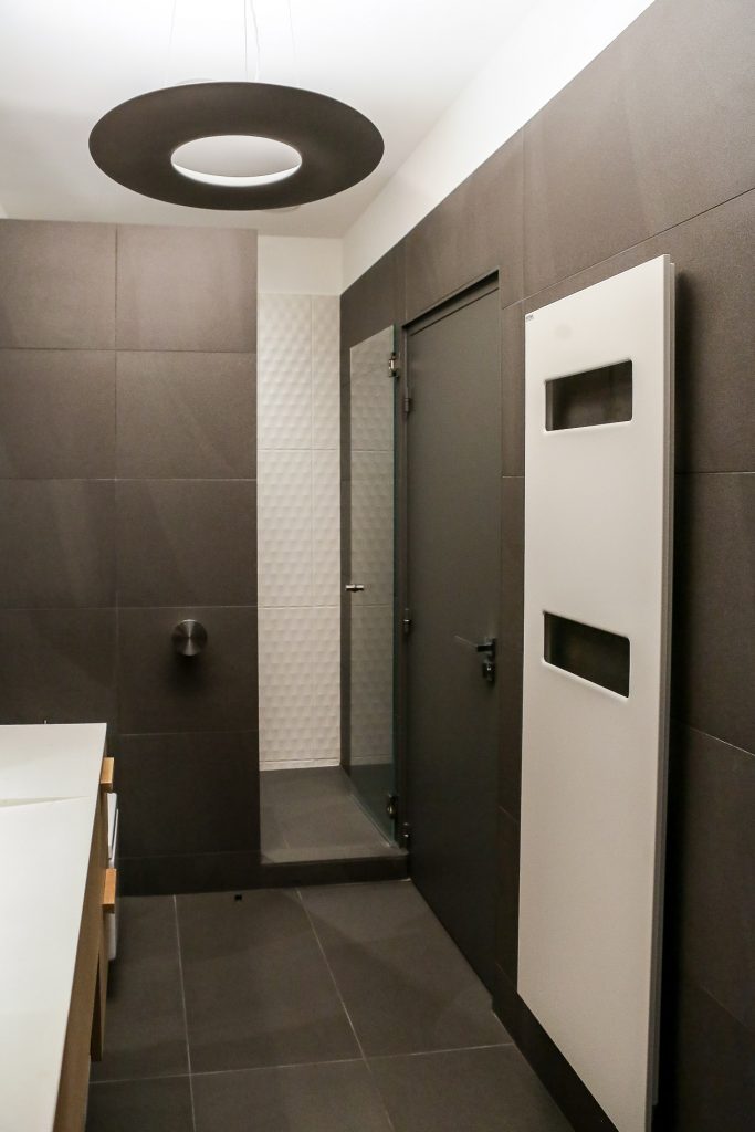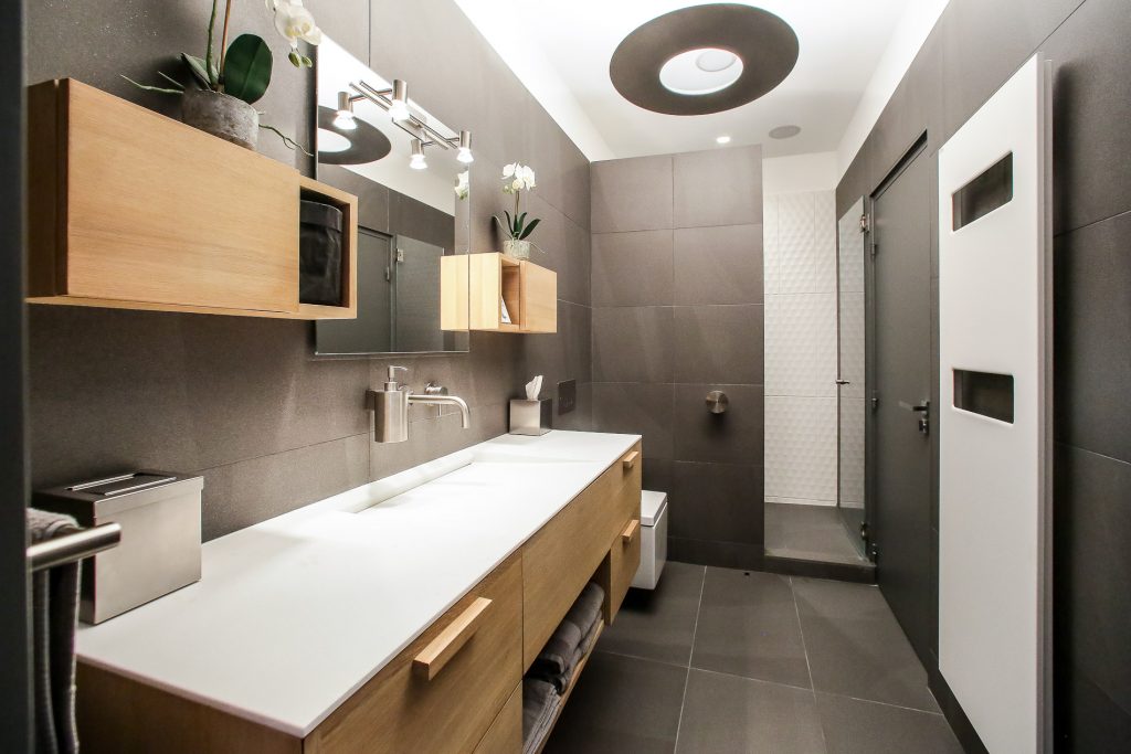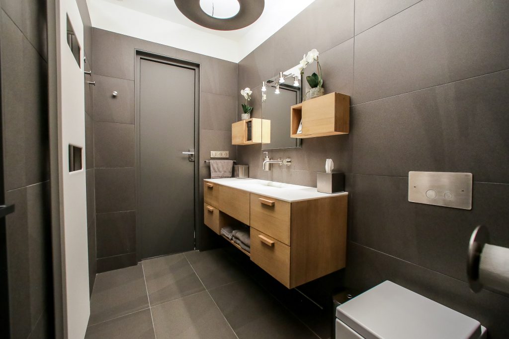 Pour la conception de cet espace, mon choix s’est porté sur un carrelage gris avec incrustations de minéraux qui lui apporte de la lumière. j’ai également joué le contraste avec une faïence blanche mate au relief géométrique très contemporain. J’ai fait réaliser un meuble sur-mesure en chêne clair avec tiroirs coulissants surmonté d’une vasque en marbre taillée directement dans la pierre avec caniveau intégré, deux meubles suspendus, un miroir avec spots intégrés. La robinetterie de la douche et de la vasque est encastrée tout comme la plaque de commande des toilettes ou encore les charnières du pare-douche également conçu sur-mesure. Le wc suspendu carré est très design et minimaliste en réponse au sèche-serviettes et à la suspension en bêton du même gris que le carrelage. J’ai choisi le linge de bain dans des tonalités grises et les accessoires en inox mat: petite poubelle, distributeur de mouchoirs, porte-serviette, porte-rouleau, garniture de toilette.