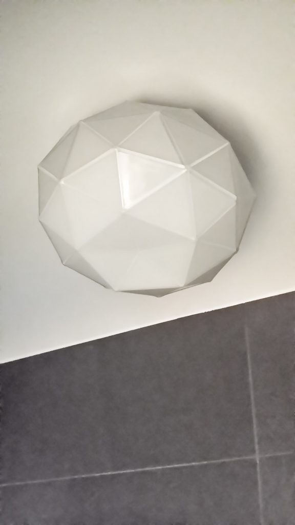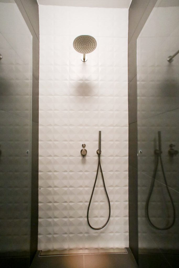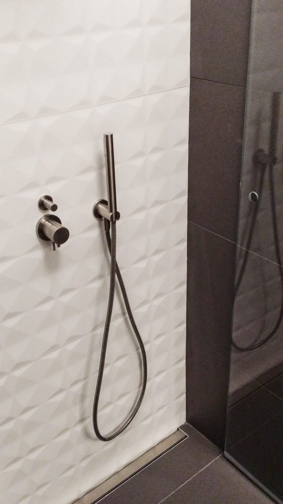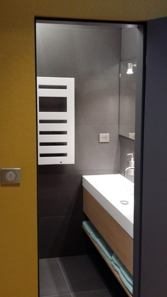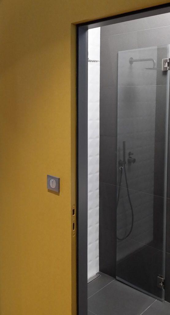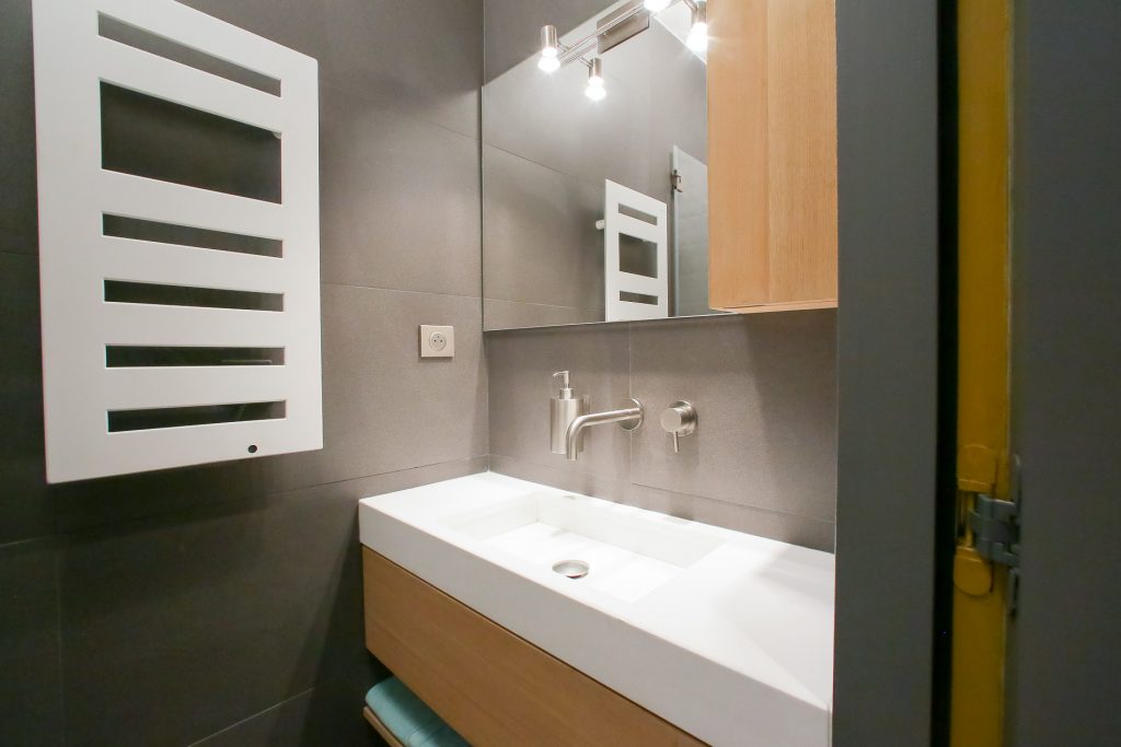 La conception de cette pièce d’eau a été un challenge car la surface était extrêmement réduite. La douche est italienne, donc le sol de la salle de bain se poursuit directement dans la douche sans qu’il y ait une marche. C’est très esthétique et libère de la place au sol. Le pare-douche a été réalisé sur-mesure et est en verre transparent pour agrandir l’espace. La robinetterie est encastrée et le ciel de pluie offre un joli volume. Les fixations du pare-douche, la robinetterie et le distributeur de savon mural sont dans une finition très contemporaine, l’inox mat. Le sèche-serviettes est design et rappelle le blanc de la vasque taillée dans du marbre. La faïence de la douche en relief pour contraster avec le carrelage gris reprend le motif du plafonnier. J’ai fait réaliser sur-mesure le miroir avec spots intégrés ainsi que le meuble sous plan et la colonne de rangement en chêne clair mat. J’ai choisi du linge de bain vert d’eau pour la touche tendance et l’harmonie avec le moutarde du couloir.