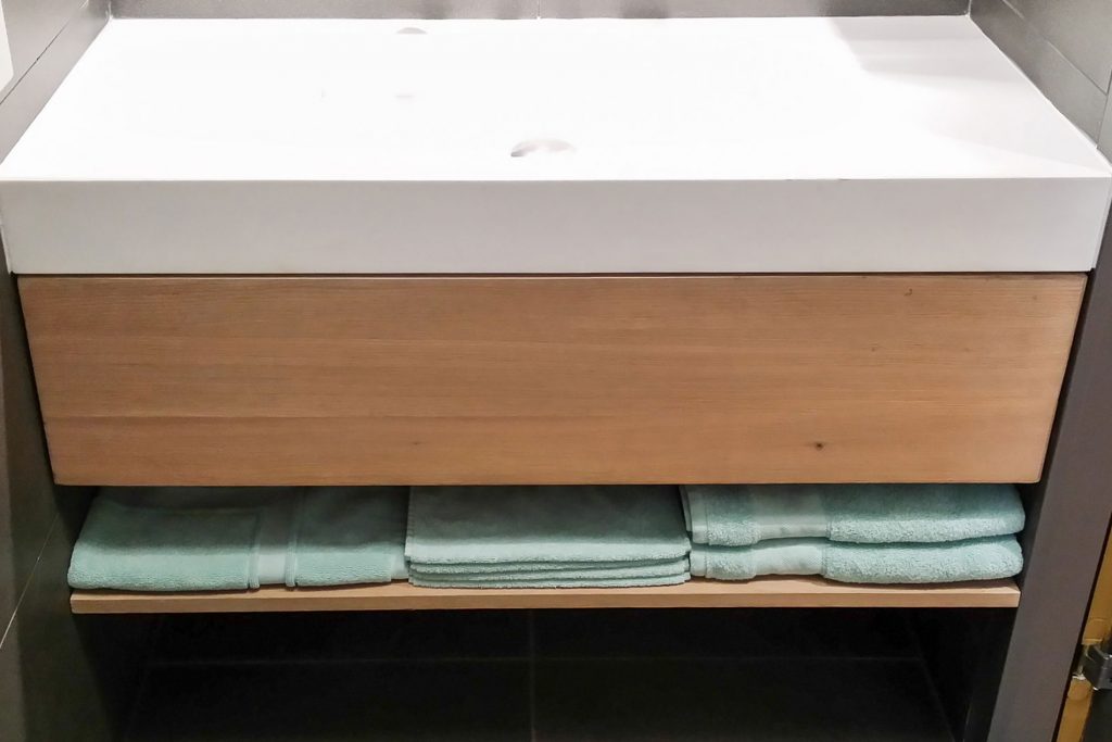 La conception de cette pièce d’eau a été un challenge car la surface était extrêmement réduite. La douche est italienne, donc le sol de la salle de bain se poursuit directement dans la douche sans qu’il y ait une marche. C’est très esthétique et libère de la place au sol. Le pare-douche a été réalisé sur-mesure et est en verre transparent pour agrandir l’espace. La robinetterie est encastrée et le ciel de pluie offre un joli volume. Les fixations du pare-douche, la robinetterie et le distributeur de savon mural sont dans une finition très contemporaine, l’inox mat. Le sèche-serviettes est design et rappelle le blanc de la vasque taillée dans du marbre. La faïence de la douche en relief pour contraster avec le carrelage gris reprend le motif du plafonnier. J’ai fait réaliser sur-mesure le miroir avec spots intégrés ainsi que le meuble sous plan et la colonne de rangement en chêne clair mat. J’ai choisi du linge de bain vert d’eau pour la touche tendance et l’harmonie avec le moutarde du couloir.