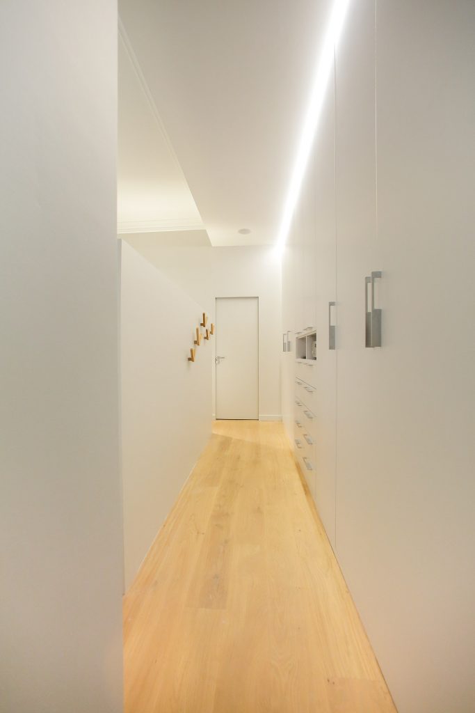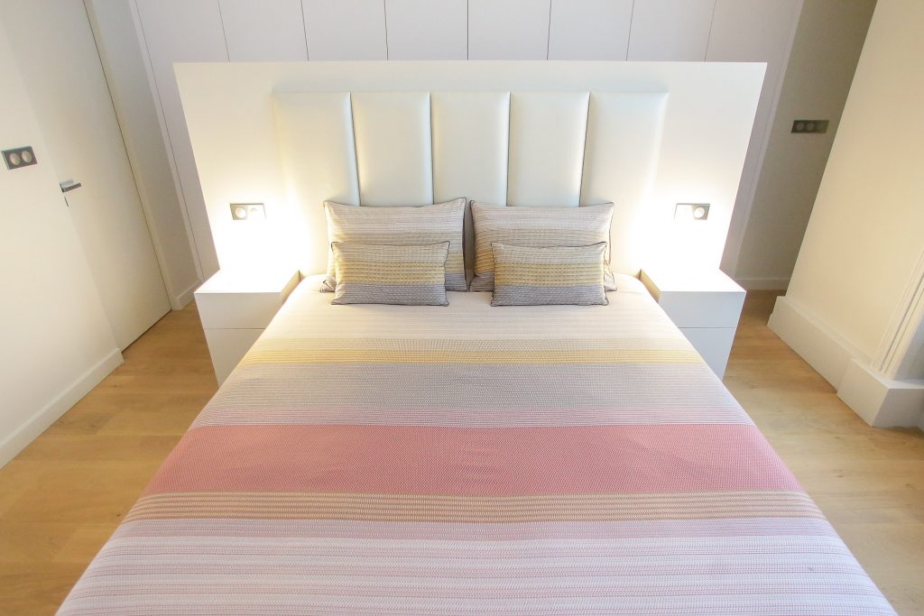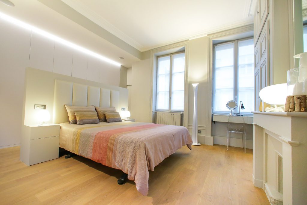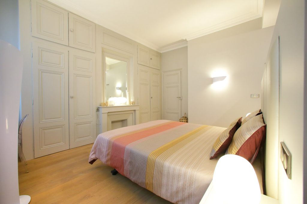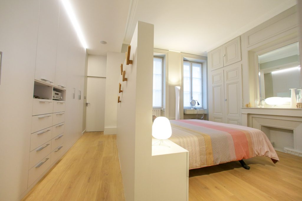 Pour cette belle et vaste suite parentale au cachet évident avec accès direct à deux salles de bain, je souhaitais apporter un côté très contemporain. J’ai donc positionné un long dressing sur la totalité du mur du fond pour offrir un grand volume de rangement et j’ai fait aménager l’ensemble des placards existants. J’ai positionné en face une cloison basse avec porte-manteau, chevets et lampe à poser intégrés. J’ai fait réaliser une tête de lit en tissu capitonné dans le même coloris grège que les murs. J’ai choisi cette parure de lit aux motifs géométriques très tendance. J’ai dessiné la coiffeuse suspendue placée face à la lumière du jour. Un amplificateur est relié à deux enceintes encastrées dans le nouveau faux-plafond. Côté luminaires, un lampadaire et une applique couleur blanc brillant aux lignes courbes, une lampe à poser sur la cheminée et un long bandeau de LED encastré pour irradier tout le dressing. Enfin, j’ai fait réaliser des stores sur-mesure en voilage et j’ai sélectionné les objets décoratifs.