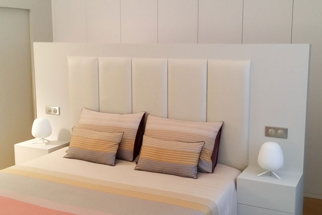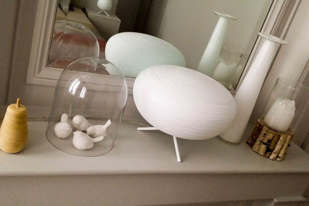 Pour cette belle et vaste suite parentale au cachet évident avec accès direct à deux salles de bain, je souhaitais apporter un côté très contemporain. J’ai donc positionné un long dressing sur la totalité du mur du fond pour offrir un grand volume de rangement et j’ai fait aménager l’ensemble des placards existants. J’ai positionné en face une cloison basse avec porte-manteau, chevets et lampe à poser intégrés. J’ai fait réaliser une tête de lit en tissu capitonné dans le même coloris grège que les murs. J’ai choisi cette parure de lit aux motifs géométriques très tendance. J’ai dessiné la coiffeuse suspendue placée face à la lumière du jour. Un amplificateur est relié à deux enceintes encastrées dans le nouveau faux-plafond. Côté luminaires, un lampadaire et une applique couleur blanc brillant aux lignes courbes, une lampe à poser sur la cheminée et un long bandeau de LED encastré pour irradier tout le dressing. Enfin, j’ai fait réaliser des stores sur-mesure en voilage et j’ai sélectionné les objets décoratifs.