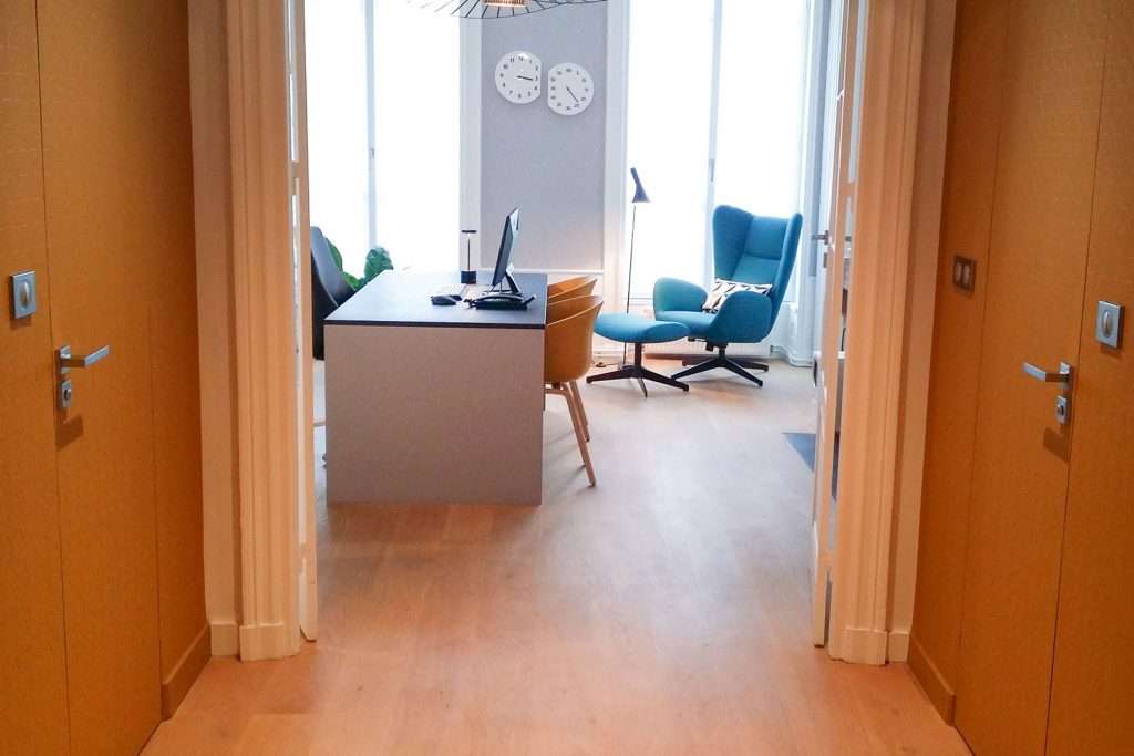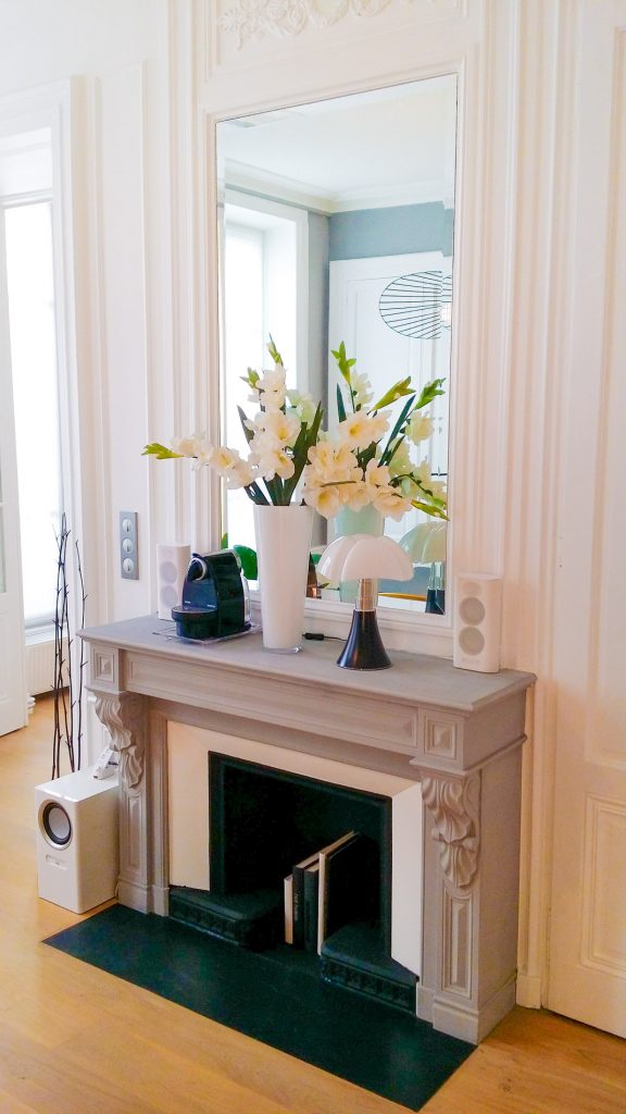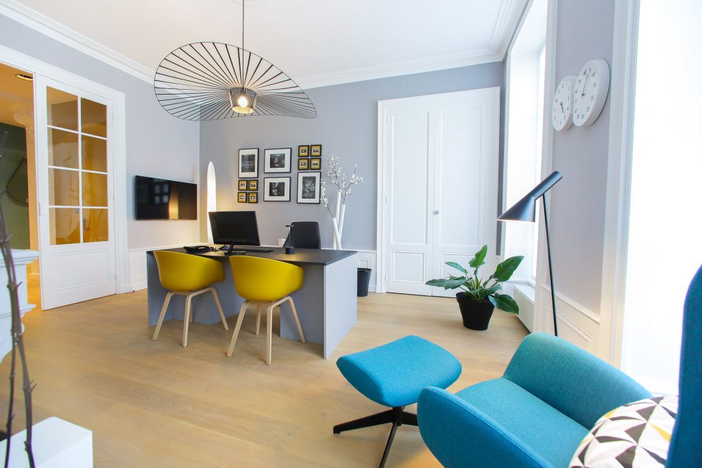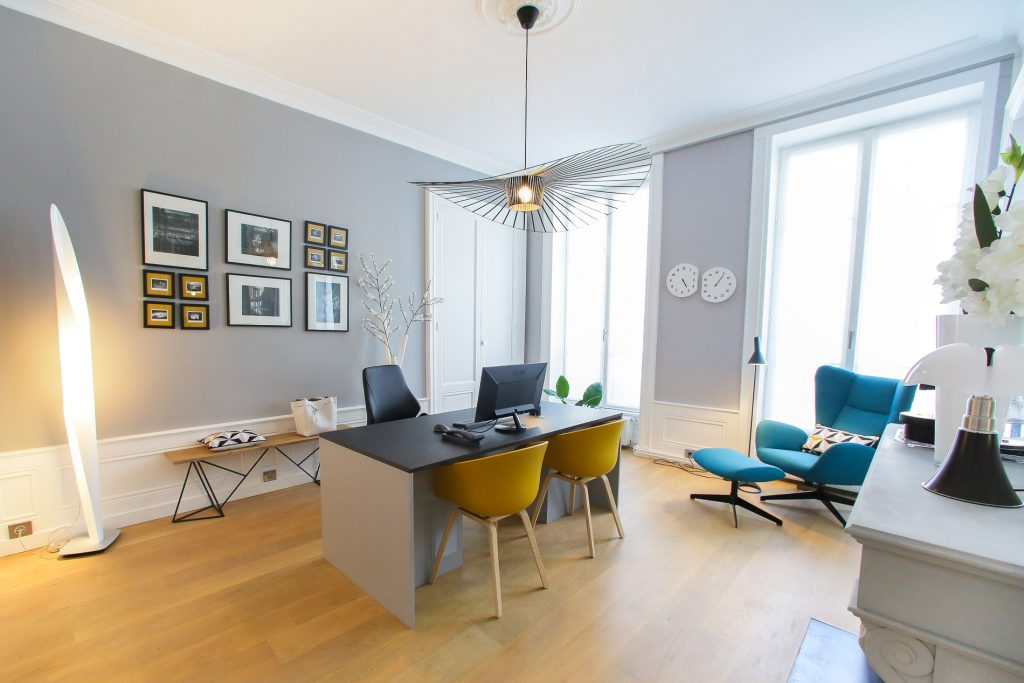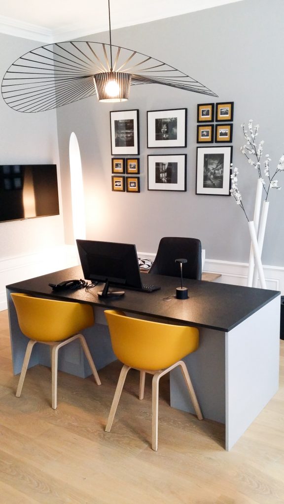 Pour l’aménagement et la décoration de ce bureau, j’ai choisi de travailler autour du gris, du blanc et du noir pour la sobriété, du moutarde et du bleu canard pour la tendance. J’ai dessiné le bureau avec structure en bois laqué et plateau en pierre, l’alimentation électrique arrive sous le bureau. J’ai choisi le fauteuil de direction, les fauteuils de réception, un grand fauteuil en tissu avec son repose-pieds, un banc en bois avec structure métal. J’ai fait aménager tous les placards. Pour habiller les murs, j’ai opté pour un porte-manteau stylisé, un grand écran pour dupliquer l’ordinateur, une composition de cadres photos, une horloge double très design. Une peinture minérale a été appliquée sur la cheminée dont le nouveau seuil est en ardoise. J’ai fait réaliser des stores en voilage pour le vis-à-vis et des coussins. J’ai changé la rosace pour accueillir cette majestueuse suspension accompagnée d’un lampadaire, d’une liseuse et de deux lampes à poser. J’ai finalisé le projet avec des objets décoratifs et des végétaux.