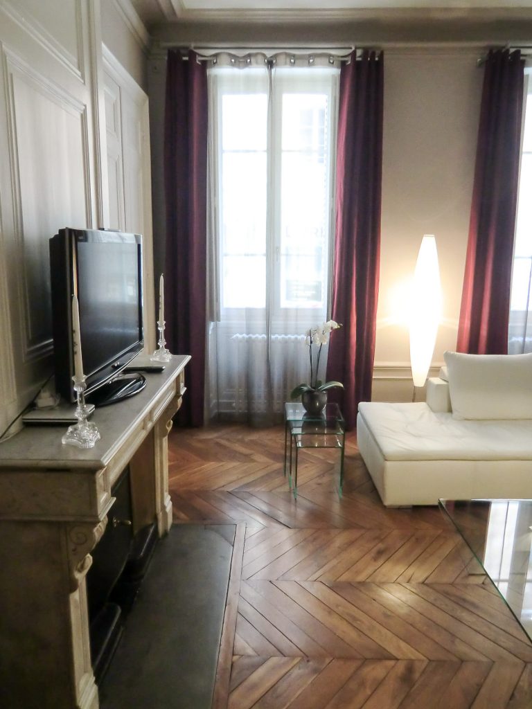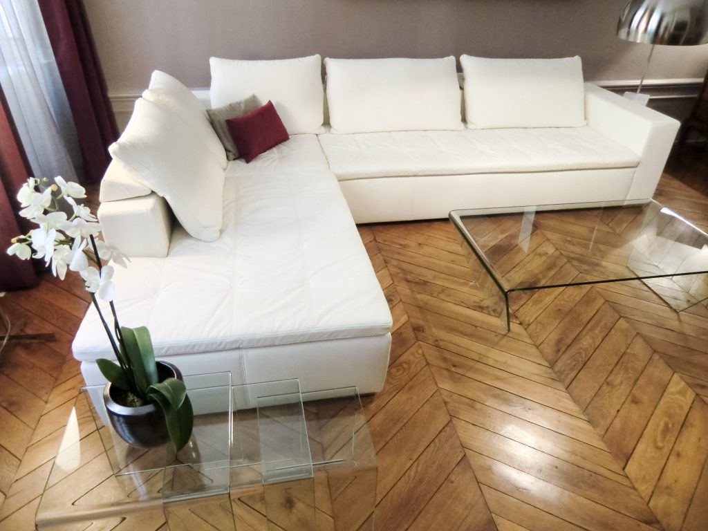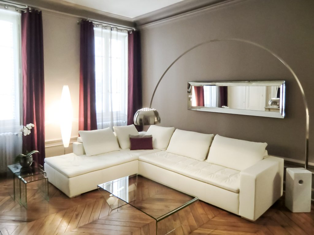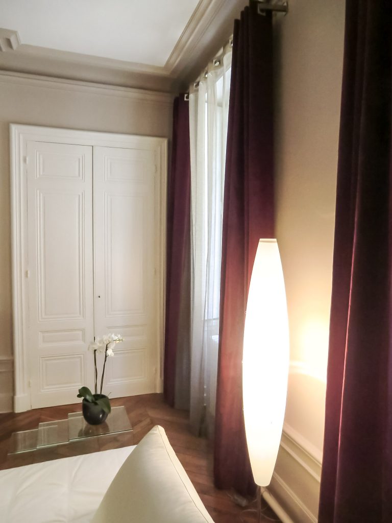 Ce salon fermé avait déjà beaucoup de cachet grâce à sa belle hauteur sous plafond, ses corniches, ses grandes fenêtres, son parquet chevron, sa cheminée d’époque. Pour l’aménagement de cette pièce de détente, j’ai fait le choix de ce grand canapé d’angle en cuir blanc aux lignes intemporelles, de cette table basse et des ces tables gigognes en verre transparent qui allègent l’espace, de ce long miroir avec encadrement qui donne de la profondeur. Concernant le code couleur, je suis partie sur du taupe clair et foncé, du bordeaux et du blanc. Côté luminaires, j’ai opté pour des lampadaires; le premier apporte de la douceur avec ses lignes courbes et le second, en forme de colonne, apporte une lumière douce et diffuse. Pour l’habillage des fenêtres, j’ai fait réaliser sur-mesure des voilages fins pour ne pas perdre en luminosité dans la mesure où il s’agissait d’un appartement au rez-de-chaussée et des double-rideaux bordeaux. Une orchidée et des chandeliers en cristal apportent la touche finale.