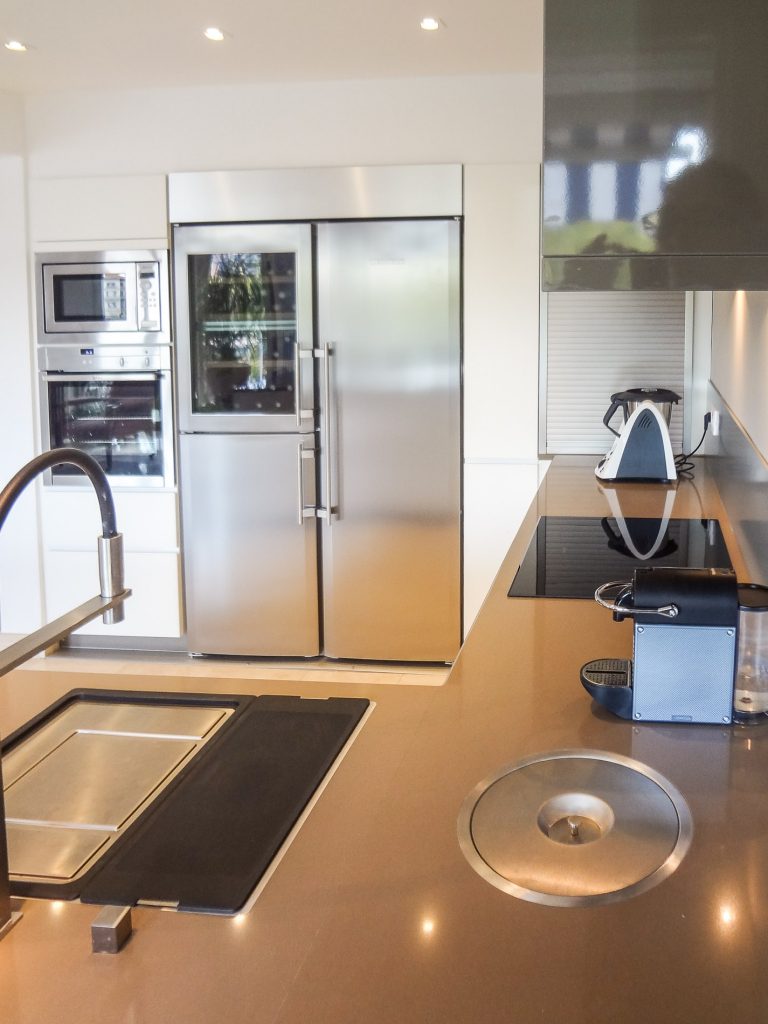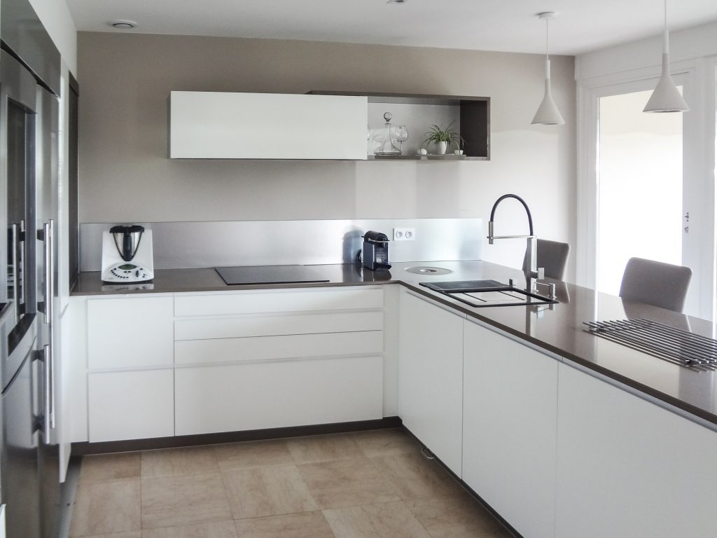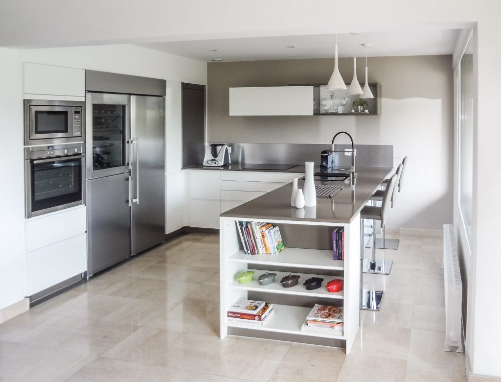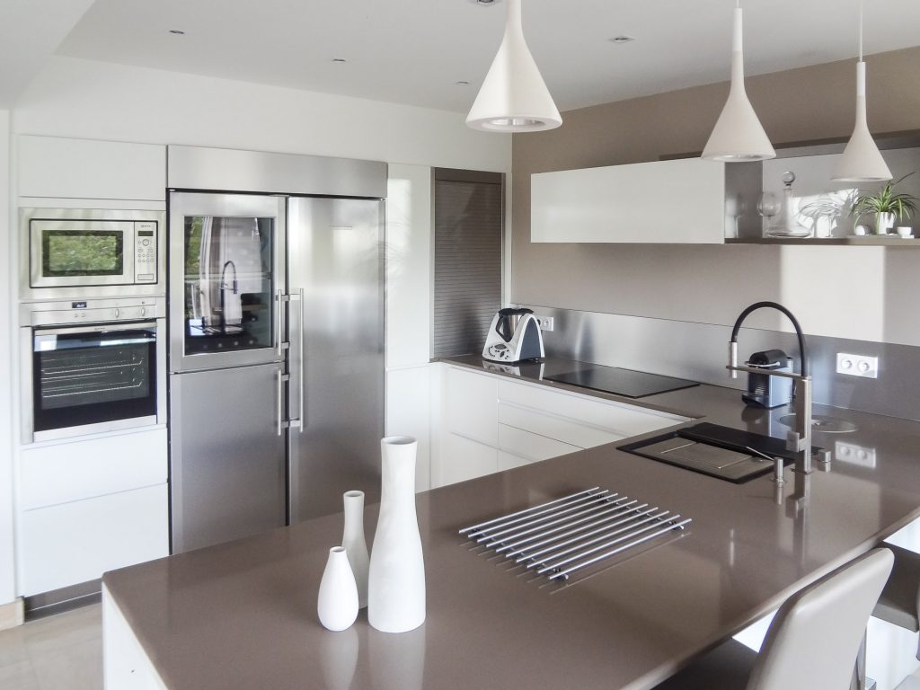Dans le cas de cette cuisine ouverte sur la pièce à vivre, j’avais pour contrainte d’intégrer le réfrigérateur américain de mes clients, j’ai donc pensé un mur technique pouvant l’accueillir ainsi que le four et le four micro-ondes. J’en ai profité pour intégrer dans la continuité du mur un meuble rideau d’aspect inox brossé comme l’ensemble des appareils électriques et le mitigeur afin de cacher le petit électroménager en dehors du robot et de la machine à café qu’ils souhaitent visibles. Les éléments bas sont en L et les portes sans poignée apportent de la pureté à l’ensemble. Un élément long en faible hauteur habille le mur, accueille la hotte et propose du rangement. Le plan de travail est en pierre et il intègre la cuve agrémentée d’un égouttoir amovible ainsi qu’une petite poubelle en accès direct dans l’angle. L’îlot accueille un espace repas avec une partie bibliothèque qui l’harmonise avec le salon, sa mise en lumière est assurée par le biais de trois belles suspensions d’aspect bêton mat coloris blanc.