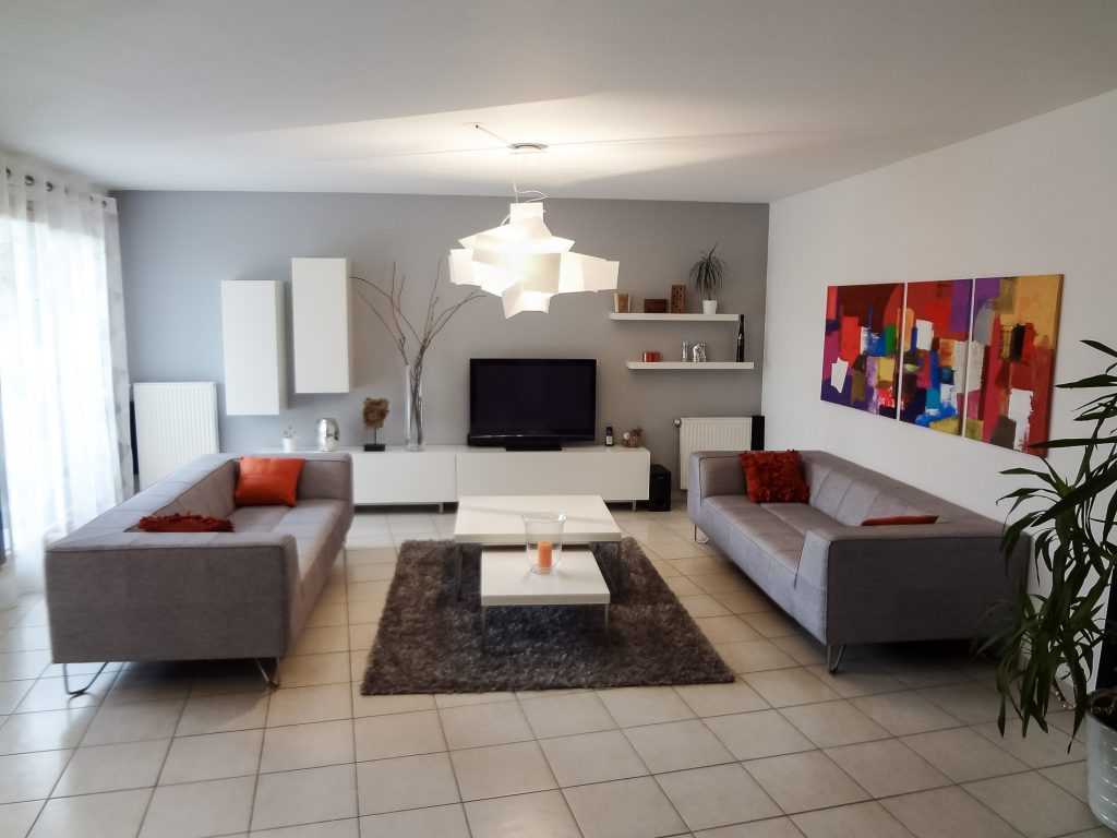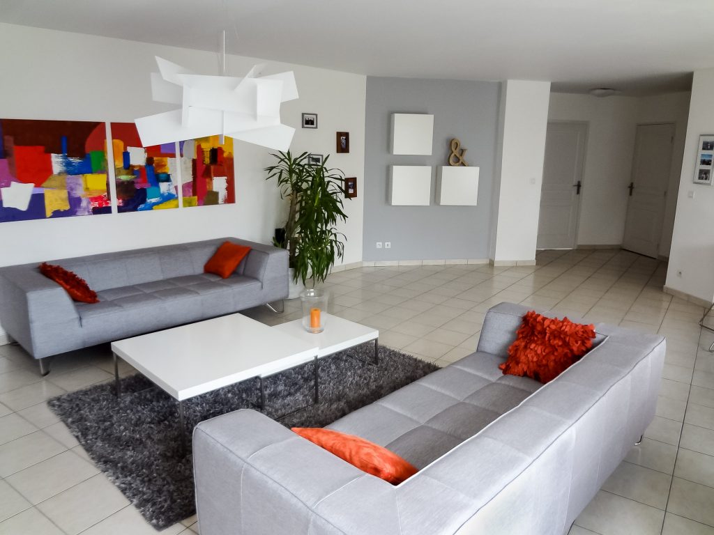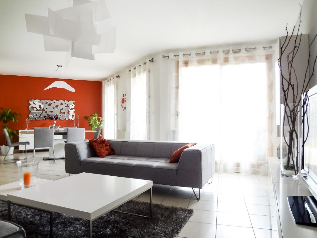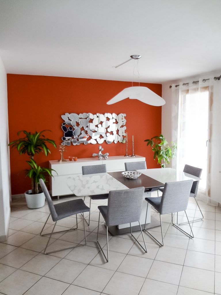 Pour cette vaste pièce à vivre, il fallait penser un espace salon spacieux. Pour ce faire, j’ai choisi ces deux canapés aux lignes très épurées d’un gris lumineux, une table basse sobre, un meuble bas pour l’univers high-tech accompagné de sa composition murale de rangements sans poignées et d’étagères, qui répondent aux cubes suspendus à l’entrée de la pièce et au buffet de l’espace salle à manger. Au-dessus de ce meuble sont placés divers objets décoratifs et un grand miroir galet aux formes minérales qui se marie aux végétaux de la pièce. Les chaises ont été réalisées dans le même tissu que le canapé pour harmoniser les deux espaces. J’ai accordé un soin tout particulier au choix de ces deux belles suspensions qui apportent beaucoup de style. Concernant l’habillage des fenêtres, mon choix s’est porté sur des voilages vaporeux qui cachent le vis-à-vis sans diminuer la luminosité naturelle. Le choix de l’orange booste le camaïeu de gris et blanc de l’espace.