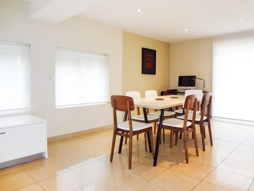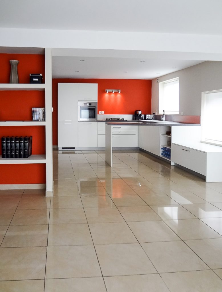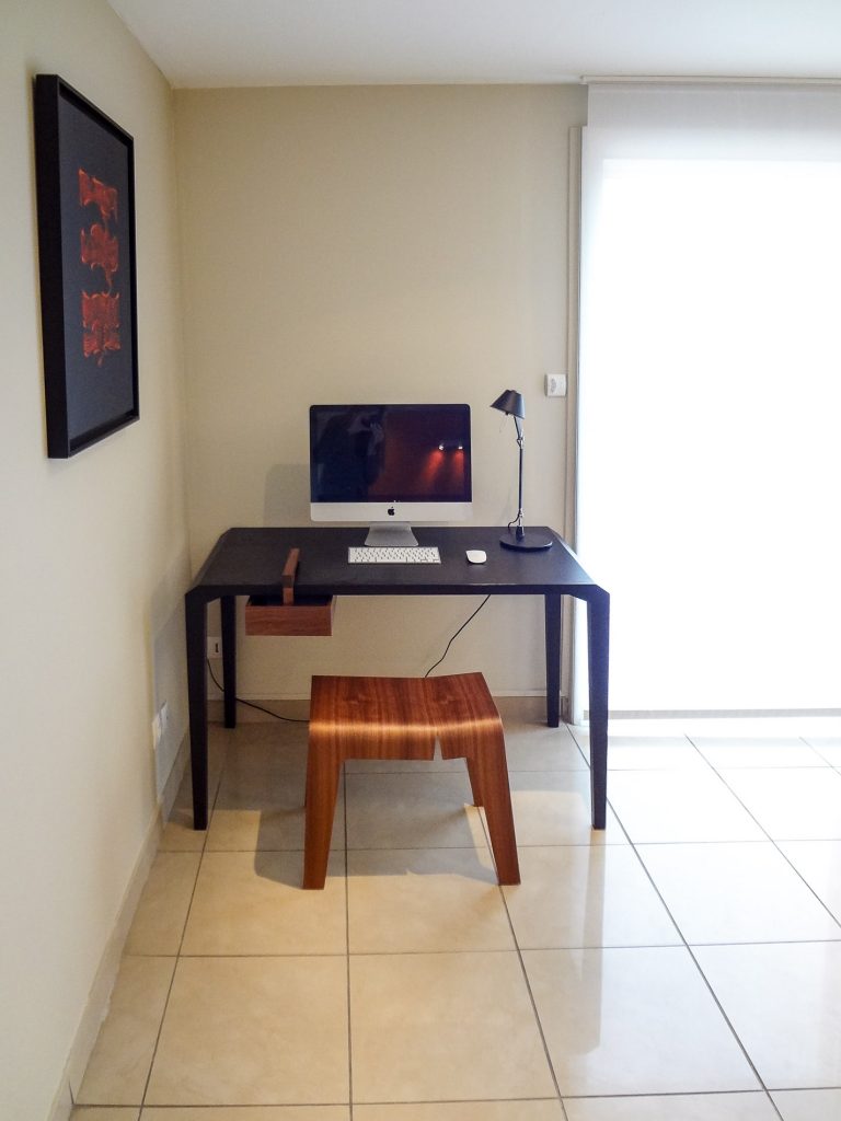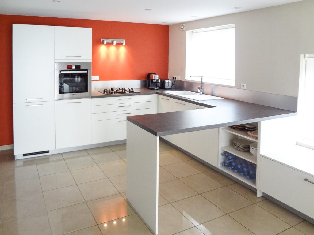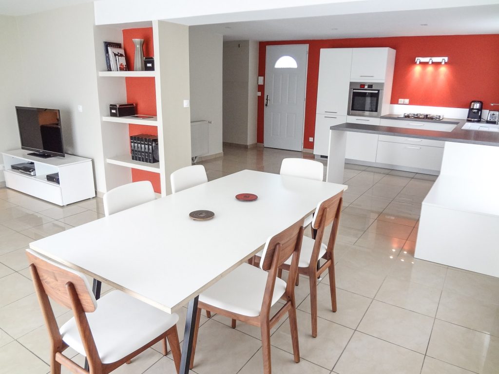 Pour cette vaste cuisine ouverte sur la pièce à vivre, il fallait gérer une contrainte d’emplacement: son positionnement en angle avec les deux fenêtres. J’ai donc travaillé sur une conception en partie basse en grande longueur sur différents niveaux pour apporter un maximum de rangements. Son coloris blanc est rehaussé par le brun cuivré du plan de travail et le coloris brique des peintures, tout cela s’harmonise avec le beige du carrelage existant. La table de repas et les chaises avec finition noyer apportent une touche art déco et se marient avec le bureau placé non loin et son tabouret assorti ainsi qu’avec le meuble télé blanc et intemporel. La bibliothèque a été réalisée en placo plâtre et reprend pour son fond la couleur brique de la cuisine. Les stores en conception sur-mesure filtrent la lumière pour la rendre diffuse et coupe tout vis-à-vis. La hauteur sous plafond étant basse, j’ai opté pour des spots encastrés et non des suspensions qui auraient pu alourdir le volume supérieur de la pièce.