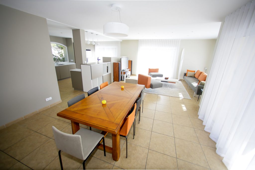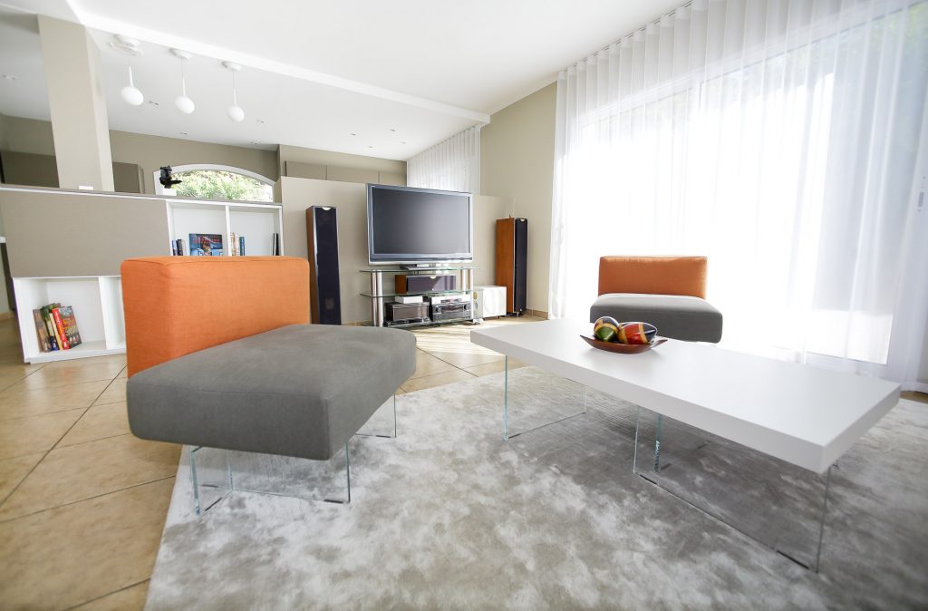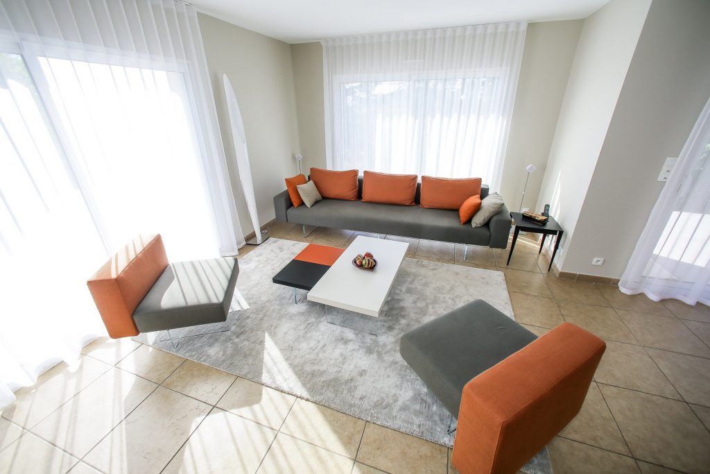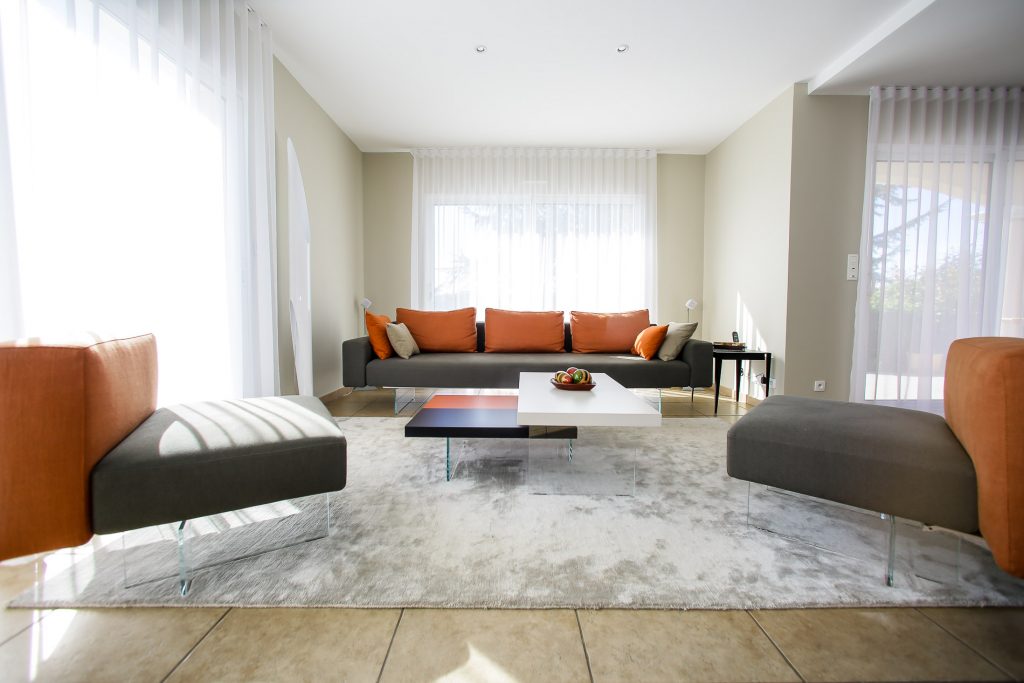Dans cette vaste pièce à vivre, j’avais pour contrainte de couleur le carrelage beige existant. J’ai donc proposé une harmonie de blanc, taupe, grège, orange brique avec une touche de noir pour les différents aménagements et pour la peinture. Mon choix s’est porté sur les deux fauteuils, le canapé et la table basse modulable qui forment un ensemble très contemporain avec un piètement en verre qui donne l’impression qu’ils flottent dans l’espace. J’ai fait un rappel des tissus choisis sur les chaises pour faire fusionner le salon et la salle à manger. En complément, j’ai retenu un bout de canapé en acier noir très élégant et un grand tapis à poils longs pour l’effet de style. J’ai conçu un espace bibliothèque modulable près du meuble télé. Pour les luminaires, j’ai fait le choix d’un grand lampadaire proposant une lumière indirecte et une suspension qui trône au-dessus de la table de repas. Concernant l’habillage des baies vitrées, j’ai fait réaliser sur-mesure des voilages qui apportent lumière et légèreté à l’ensemble.