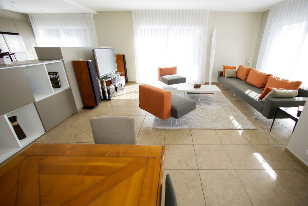 Dans cette vaste pièce à vivre, j’avais pour contrainte de couleur le carrelage beige existant. J’ai donc proposé une harmonie de blanc, taupe, grège, orange brique avec une touche de noir pour les différents aménagements et pour la peinture. Mon choix s’est porté sur les deux fauteuils, le canapé et la table basse modulable qui forment un ensemble très contemporain avec un piètement en verre qui donne l’impression qu’ils flottent dans l’espace. J’ai fait un rappel des tissus choisis sur les chaises pour faire fusionner le salon et la salle à manger. En complément, j’ai retenu un bout de canapé en acier noir très élégant et un grand tapis à poils longs pour l’effet de style. J’ai conçu un espace bibliothèque modulable près du meuble télé. Pour les luminaires, j’ai fait le choix d’un grand lampadaire proposant une lumière indirecte et une suspension qui trône au-dessus de la table de repas. Concernant l’habillage des baies vitrées, j’ai fait réaliser sur-mesure des voilages qui apportent lumière et légèreté à l’ensemble.